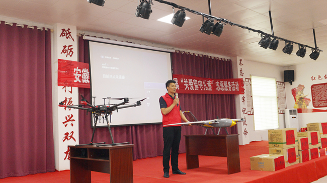 活動現場,志愿者為雙龍村和金張社區的留守兒童送上愛心書包、圖書、牛奶、洗漱包等物資,并安排了“能源開發與利用知識講座”、“觀看愛國主義短片《白衣超人》”、“無人機知識講解與現場飛行表演”等活動。精心的準備、豐富的形式、有趣的表演讓整個活動洋溢著歡樂向上的氣氛,孩子們積極參與知識問答,現場互動不停,掌聲不斷。