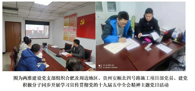 11月26日黨支部組織合肥及周邊地區、貴州安順北四號路施工項目部的黨員、建黨積極分子、入黨申請人同步開展學習宣傳貫徹黨的十九屆五中全會精神主題黨日活動,集中學習局黨委實施意見、集團黨委實施辦法、十九屆五中全會公報、習近平關于《中共中央關于制定國民經濟和社會發展第十四個五年規劃和二〇三五年遠景目標的建議》的說明、《中共中央關于制定國民經濟和社會發展第十四個五年規劃和二〇三五年遠景目標的建議》等。