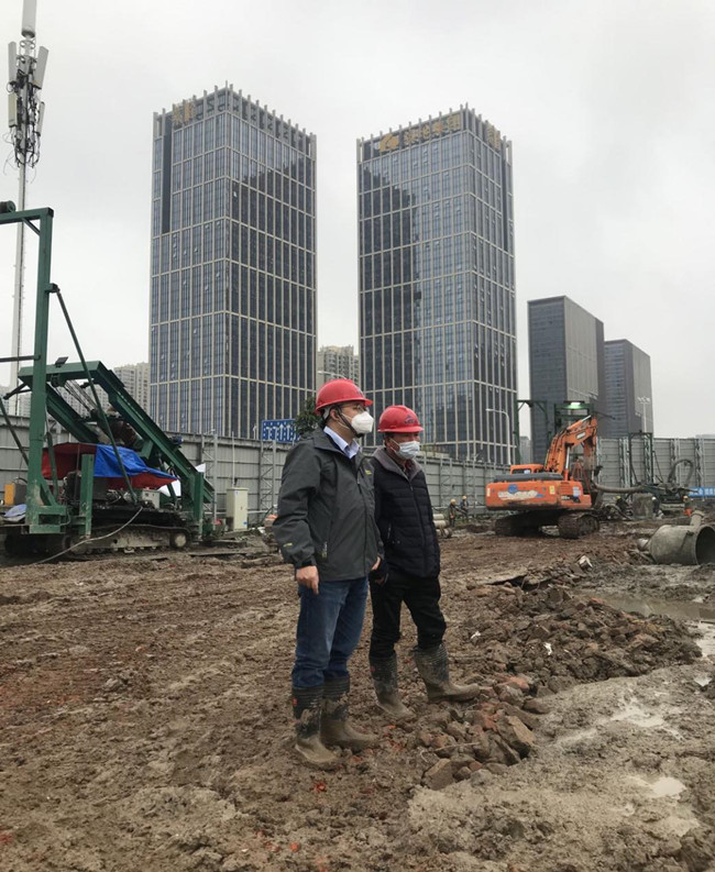 圖為2020年3月30日基礎公司經理李樞在施工人員陪同下前往施工現場指導工作