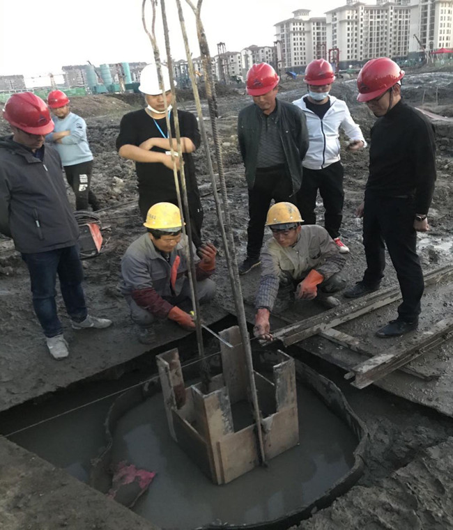 圖為項目管理人員在施工現場通過反復論證施工工藝以保證格構柱下沉時不發生位移
