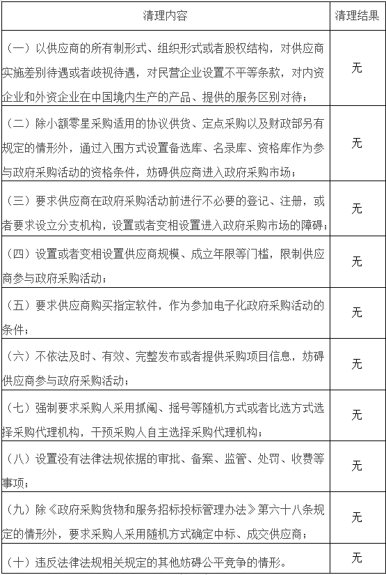 根據(jù)《財(cái)政部關(guān)于促進(jìn)政府采購(gòu)公平競(jìng)爭(zhēng)優(yōu)化營(yíng)商環(huán)境的通知》(財(cái)庫(kù)〔2019〕38號(hào))要求,我單位全面清理了政府采購(gòu)領(lǐng)域妨礙公平競(jìng)爭(zhēng)的規(guī)定和做法。經(jīng)核查:我單位在政府采購(gòu)領(lǐng)域無(wú)妨礙公平競(jìng)爭(zhēng)事項(xiàng),現(xiàn)將清理結(jié)果向社會(huì)公示如下: