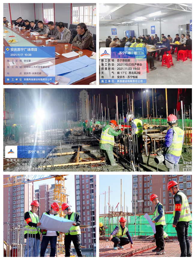 在全體人員的共同努力下,安慶蘇寧廣場項目建設進度突飛猛進、捷報頻傳。截止2021年11月24日,商業片區基坑支護工程、支架、鋼棧橋、塔吊基礎等已經基本完成,負三層地下室已經開挖;高層片區現場臨時設施已經基本完成;悅城片區現場臨時設施基本完成,基坑支護部分完成,1、2、4、5號樓已經上標準層(其中2#樓、5#樓已完成四層結構);7#負一層墻柱鋼筋綁扎完成;3#樓以及3#樓南側地庫頂板澆筑完成;4#樓與7#之間地庫墊層防水已完成。并且悅城片區1、2、4號樓主體工程建設進度均達到預售條件,超前完成甲方指定銷售節點工作任務。