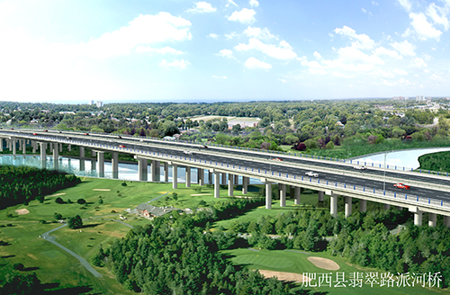 翡翠路項目于2007年開始實施建設,2009年竣工驗收合格。道路全長2500米,雙向8車道,總寬100米,其中派河橋長度約556米,是連接肥西縣與合肥市的交通樞紐,并獲得了安徽省建設工程“黃山杯”獎(省優質工程)。