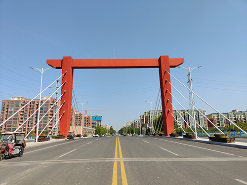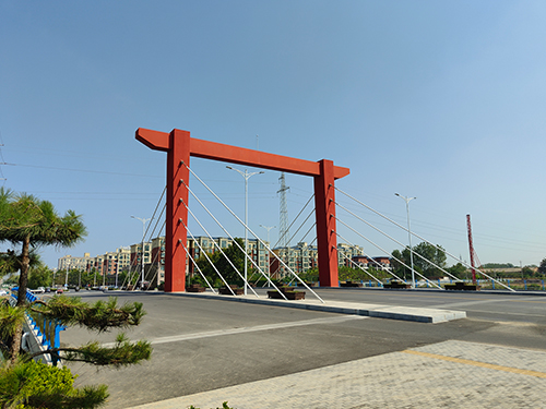 長垣市巨人大道于2021年10月開始實施建設,于2022年12月竣工驗收合格,橋梁全長66m,橋梁寬度54m,快車道雙向六車道,規劃為城市主干路。采用2×30m的等截面預應力混凝土箱型梁橋,橋上設橋塔造型,結構受力明確,通過橋塔造型展現“鋼鐵巨人起重之鄉”的意境。往南延伸,聚集了大量的起重機生產銷售企業,區域內有濃濃的“鋼鐵風貌”。長垣縣產業集聚區為國家級出口起重機械示范區,巨人大道橋以“起重機”為設計靈感,橋塔造型形似起重機,噴涂金屬漆,將工業景觀融入橋梁景觀當中,充分展現長垣縣的工業文化。