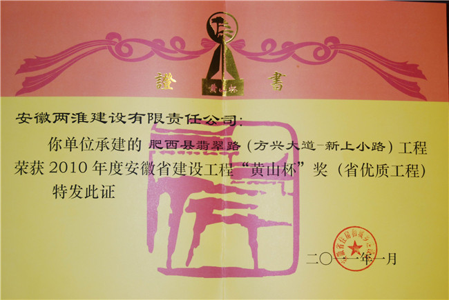 肥西翡翠路BT項目2007年8月由兩淮公司與肥西縣城投公司簽訂合同,中標合同價款1.339億元,2009年4月竣工驗收合格。結算價款為1.731億元。道路全長2500米,雙向8車道,總寬100米,其中派河橋長度約556米。該工程按業主要求在規定的時間內順利完成,無任何安全質量事故,在公司全體員工的共同努力下,該項目獲得了安徽省“黃山杯”優質工程。大大增強了肥西縣與合肥市的 連通發展。