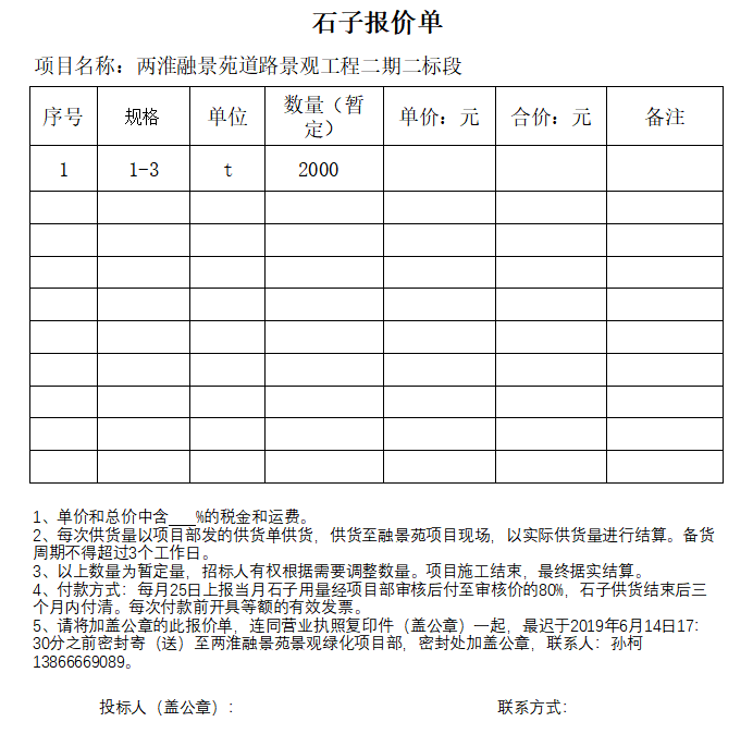 我單位位于宿州市的兩淮融景苑二期項(xiàng)目道路景觀工程二標(biāo)段需要采購1-3石子,歡迎符合條件的供應(yīng)商積極參與報(bào)價(jià)。