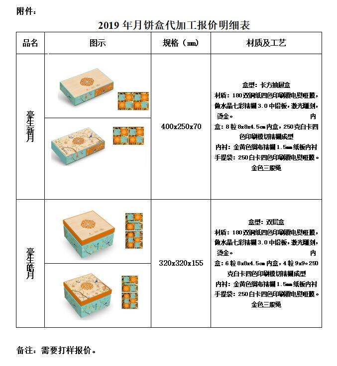 現需要貴公司對我酒店中秋月餅產品的外包裝盒進行代加工報價,盒子用材、大小、外觀及圖案均按照我酒店的設計樣盒為基準,初步確認盒子數量分為18000個和4000個,所有盒子最后交納成品時需按照我酒店的要求加印我酒店指定的LOGO。