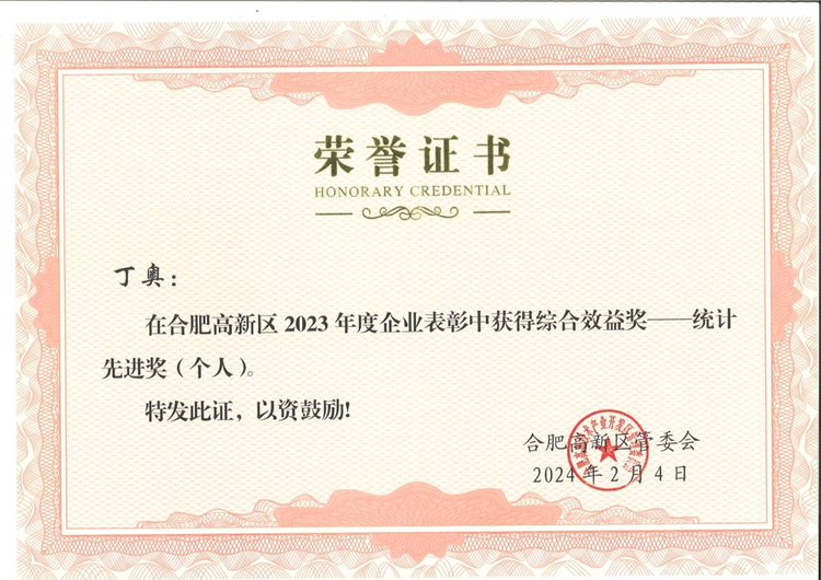 丁奧榮獲合肥高新區(qū)統(tǒng)計(jì)先進(jìn)獎(jiǎng)