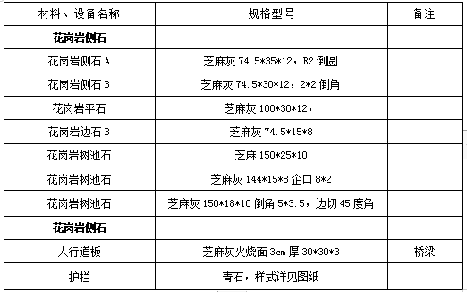 二、投標人資格1、具有獨立企業法人資格、有效執照及相應的經營范圍;2、近三年內在經營活動中沒有重大違法記錄,具有獨立承擔民事責任的能力;3、具備該項目所需花崗巖地板磚、側石的供應能力;4、供應材料需符合以下型號及相關標準(參照下表)