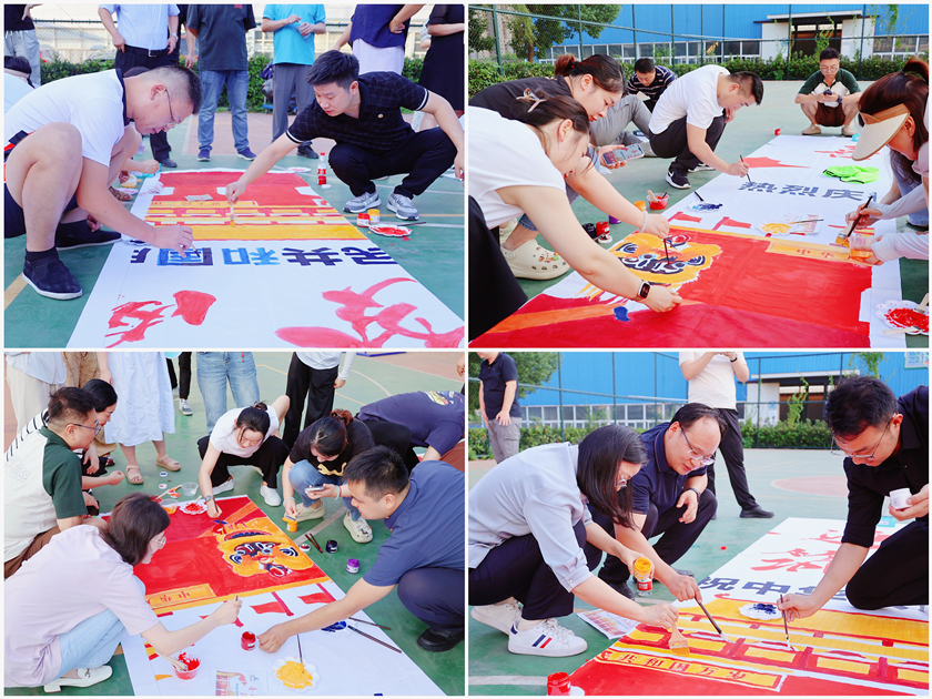金秋九月,丹桂飄香,陽光熱烈,集團室外籃球場上,來自集團各車間工會的60余名職工全神貫注地投入到巨畫繪制中。大家手持畫筆,沾上顏料,涂上顏色,用一筆一畫描繪自己對祖國的熱愛與祝福?;顒右孕〗M為單位,大家分工協作、密切配合,相互交流著、探討著,共同為了這幅巨畫而努力。