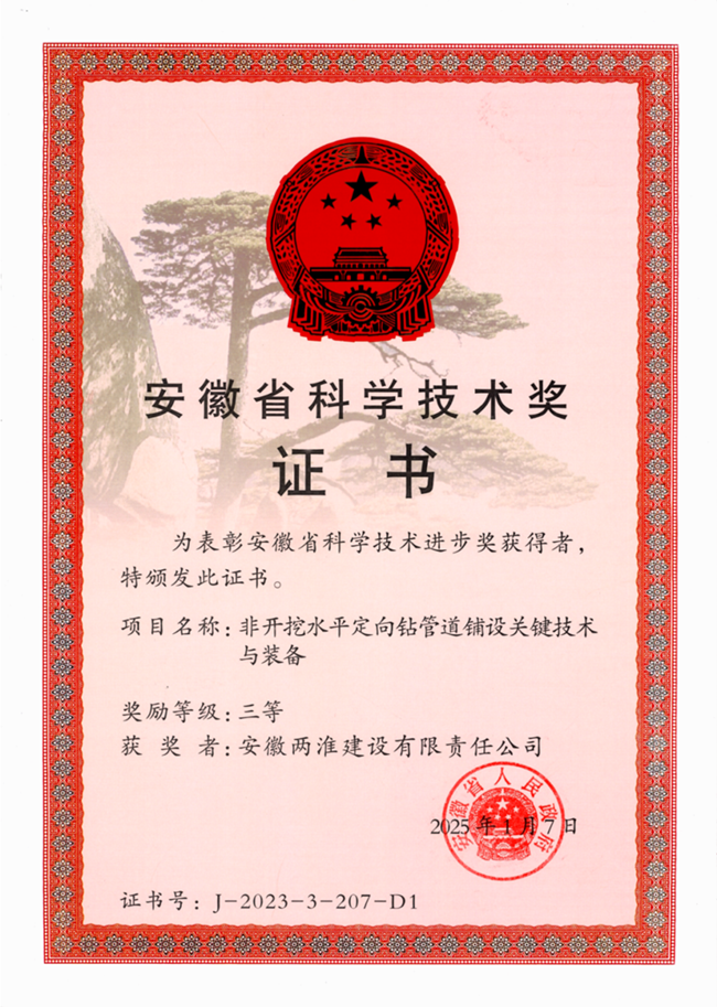 近日,安徽省科學技術獎勵大會傳來喜訊,由安徽兩淮建設有限責任公司牽頭完成的《非開挖水平定向鉆管道鋪設關鍵技術與裝備》項目榮獲2023年度安徽省科技進步三等獎,標志著兩淮建設在非開挖技術領域的創新實力和行業引領地位再獲權威認可。
